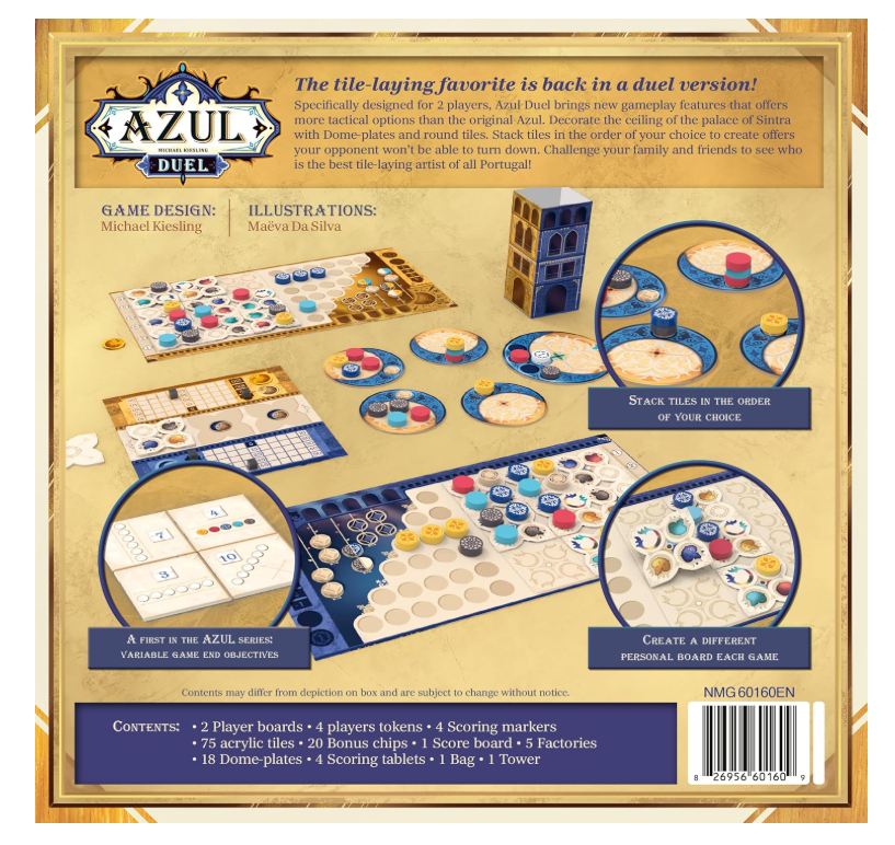📝 Una versión para dos jugadores del aclamado Azul, que conserva la belleza estética del original pero añade una nueva capa de tensión táctica. En este duelo de mosaicos, cada decisión cuenta, cada loseta puede cambiar el curso del juego y cada jugada es una oportunidad para bloquear a tu rival o brillar con estilo.